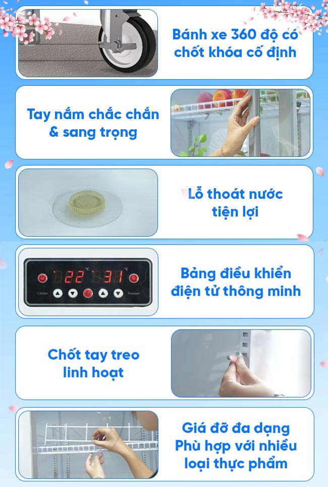 2C2CD-1100L sở hữu 4 bánh xe chịu lực cùng 2 ngăn lớn trên/ dưới để được nhiều loại đồ, thực phẩm. Sản phẩm giúp người dùng tạm biệt sương đọng, thoát khí với thiết kế đồng bộ hoàn chỉnh. Cửa kính trong tiện quan sát và vệ sinh cùng động cơ êm ái mang lại trải nghiệm dễ chịu cho người dùng. Điện tiêu hao được tiết kiệm hơn nhờ công nghệ tiên tiến có trong sản phẩm. Mời quý vị cùng Kanawa xem 4+ ưu điểm mà khách từng dùng khen nhất ở tủ làm mát 2C2CD-1100L 2 cánh ngay sau đây!